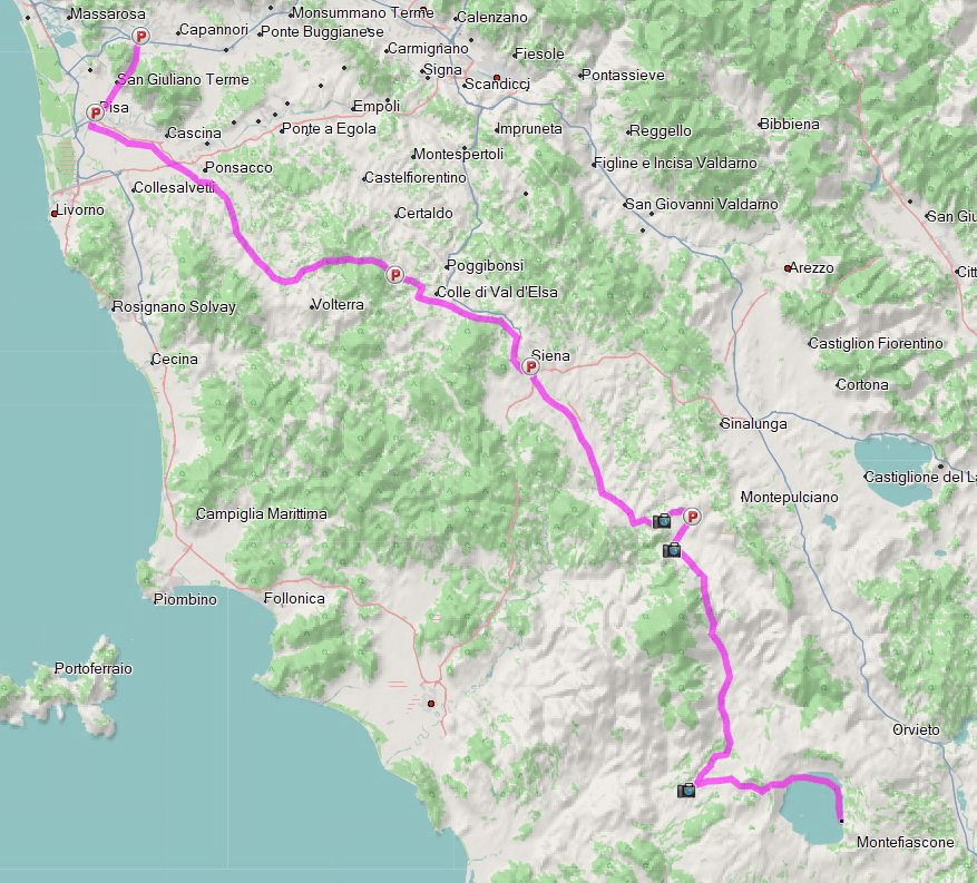 300 km waren es quer durch die Toskana. Ideal als Transferstrecke und für den, der mehr Zeit mitbringt, ebenfalls ideal für die vielen versteckten interessanten Punkte, welche die Toskana noch verbirgt.