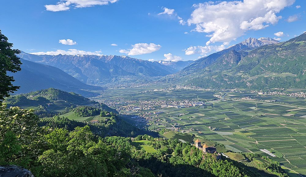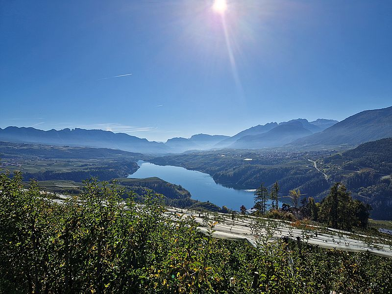 Wenn man von den umliegenden Höhenzügen auf den See zufährt, dann genießt man bereits die Ausblicke über Apfelplantagen und Weinhänge. Man fühlt sich schon wie mitten in Italien.