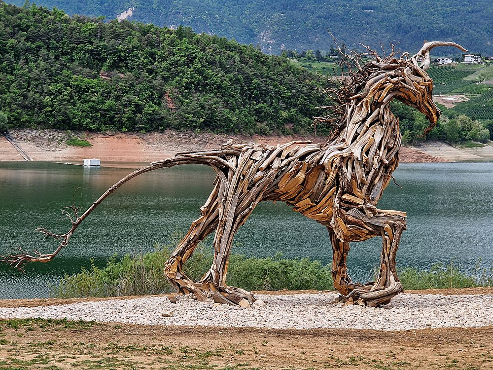 Der Holzbildhauer hat Wurzeln und Holz in Ufernähe gesammelt und daraus dann dieses Werk geschaffen. Einfach wunderbar mit einer Betonung auf „Wunder“. 7 Meter lang und 5 m hoch ist die Skulptur und somit eines Sauriers durchaus würdig.
