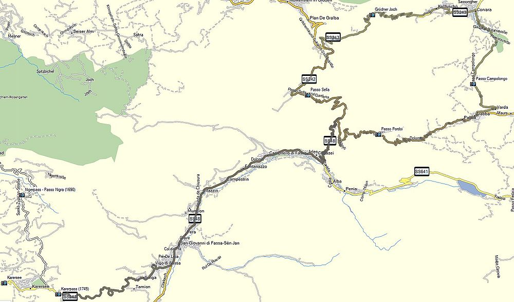 Schluss jetzt mit der Unkerei. Schließlich wollen wir heute den touristischen Höhepunkt einer jeden Dolomitenrunde mit dem Motorrad erkunden. Es geht weiter über Arabba zum Campolongo in nördliche Fahrtrichtung zum Grödnerjoch. Der Campolongo ist eigentlich mit dem Wort „unauffällig“ schon hinreichend beschrieben.