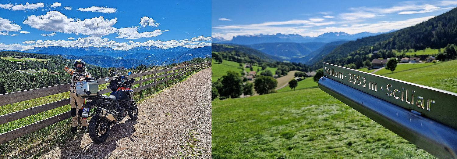Hinauf auf das Hochplateau Tschögglberg. Fotomotiv ist natürlich wieder der Schlern und der Rosengarten. Aber aus einer anderen Perspektive. Ein passender Punkt für schöne Fotomotive ist unmittelbar vor dem Ort Flaas. Wir folgen alsdann der kurvigen Streckenführung über den Schermoossattel nach Mölten.