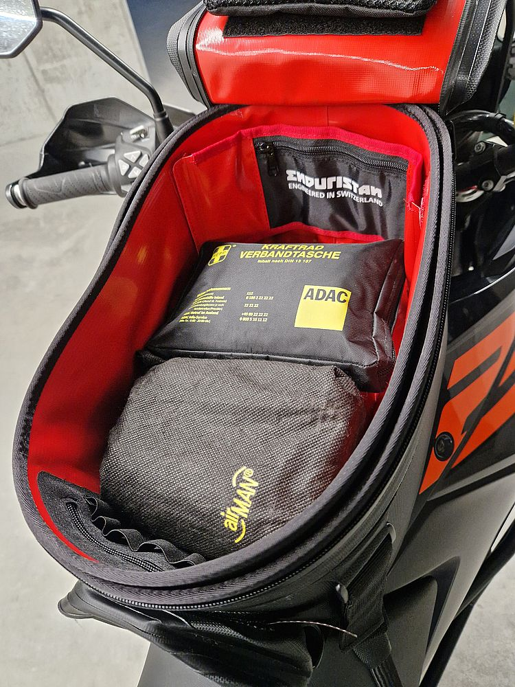 Auf der Internetseite und in einigen Foren wurde bei den Rezensionen von Nutzern auch das „rote Innenfutter“ des Sandstorm hervorgehoben. Dies insbesondere hinsichtlich der besseren Erkennbarkeit von „gesuchten Gegenständen“ im Tankrucksack. Ehrlich gesagt hat sich das für mich beim Lesen nicht so ganz erschlossen. Im Praxisbetrieb kann man dies aber faktisch bestätigen. Das rote Innenfutter des Enduristan ergibt tatsächlich einen besseren Kontrast und lässt DAS was man im Innenleben so alles eingepackt hat besser und schneller erkennen.