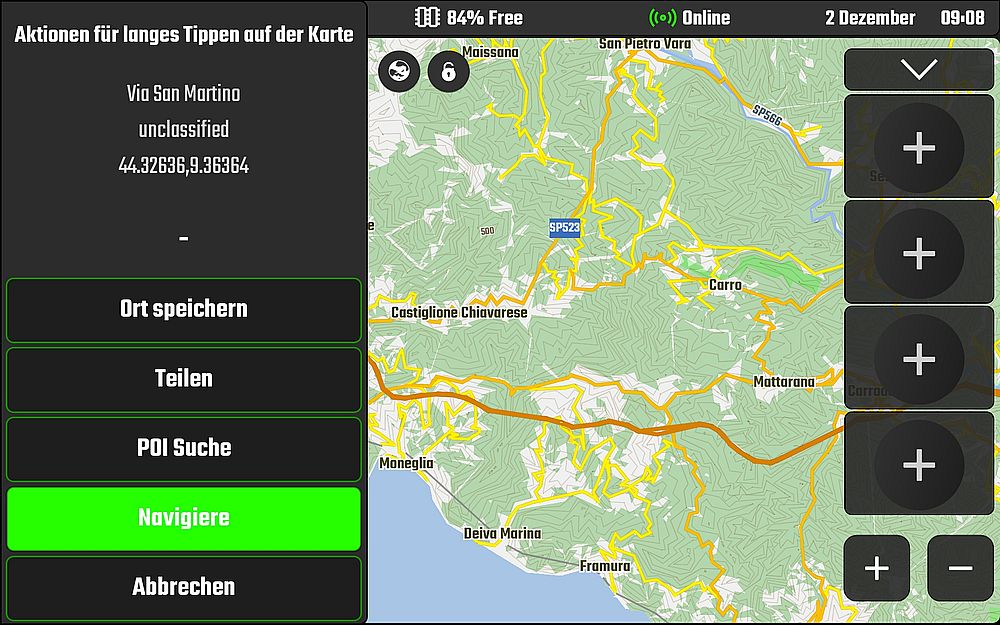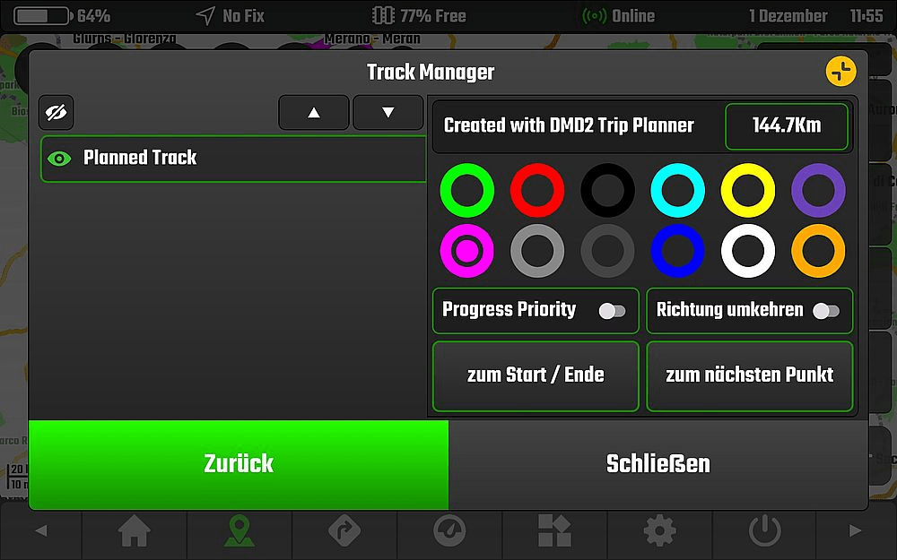 Kommen wir wegen einer Umleitung, Baustelle oder was auch immer von unserem geplanten Track ab, so ist dieser weiterhin sichtbar und unsere Abweichung wird mittels einer, ich sage mal „Linie“ die Verbindung zum Track hält, dargestellt. Ich sehe also wie ich nun in der Folge fahren muss, um wieder auf meinen geplanten Track zu gelangen.