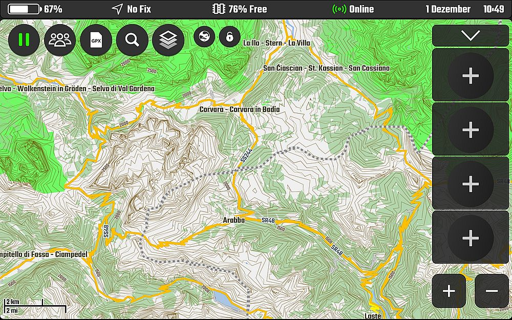 Die Farben der auf den Karten angezeigten unbefestigten Wege sagen Dir dann bei der Planung ob die Route eher einfach oder schwieriger vom Straßenbelag ist.
