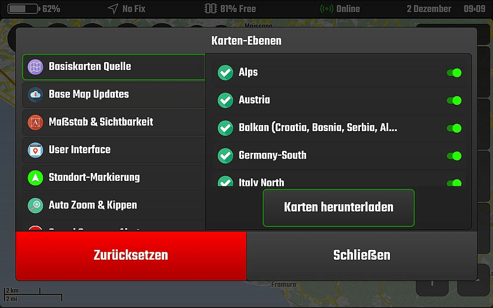 Über die Quelle Basiskarten könnte ihr die für euch erforderlichen Karten herunterladen. Diese sind absolut ausreichend und wirklich in einer guten Qualität. Wie üblich besteht auch die Möglichkeit sich interessante Punkte wie Unterkünfte, Motorrad-Werkstätten, Restaurants etc. anzeigen zu lassen.