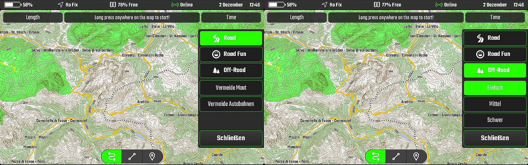 Bei der Planung kann man dann auch durchaus wechseln und bis zu einem Punkt die Road oder Road Fun Variante nutzen, um danach dann in einen der Modi Off-Road zu wechseln, respektive anschließend wieder zurück.