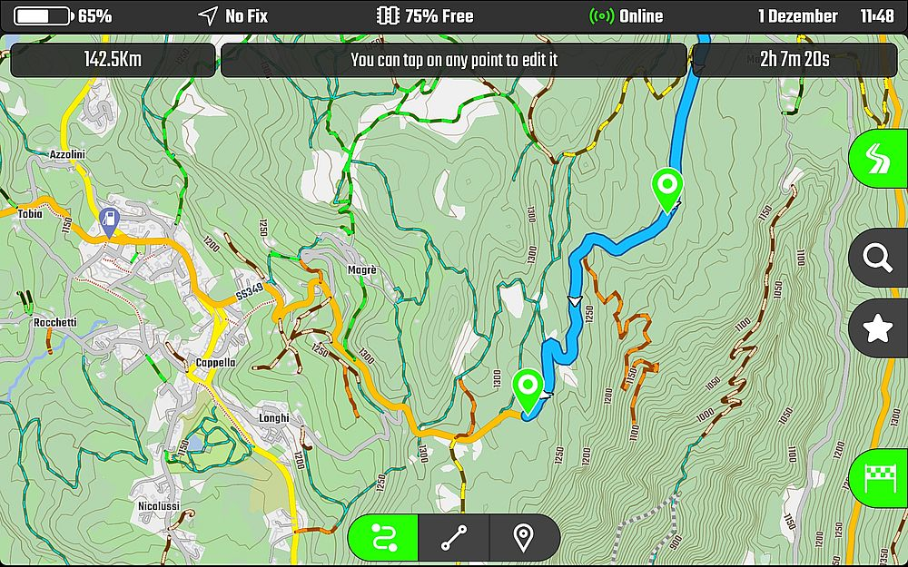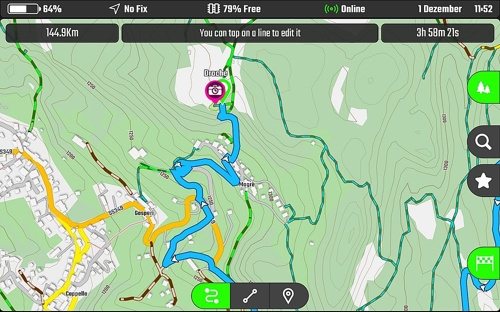 Beispielhaft habe ich auf dem folgenden Screenshot einmal den „Asphalt“ auf der Streckenplanung verlassen und bin auf „Wanderwegen“ weiter zum Drachen von Magrè gefahren. Real tun wir dies an besagter Örtlichkeit natürlich nicht, weil wir ja am guten Ruf der Motorradfahrer arbeiten.
