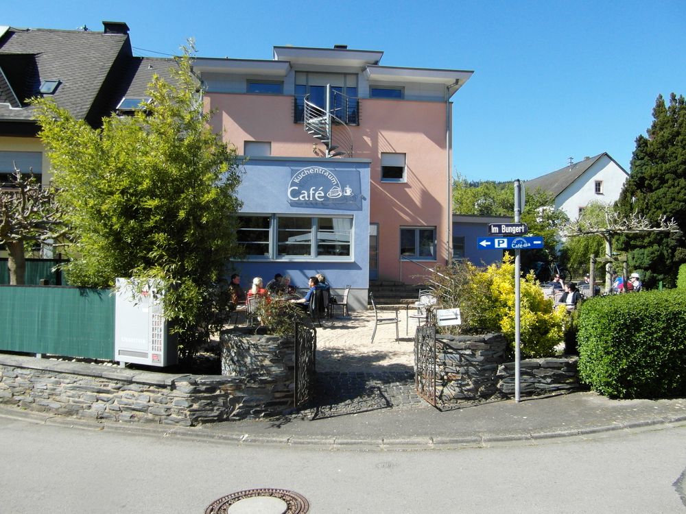 Wer hier bei der Runde die Pause in der kleinen gemütlichen Pizzeria hat ausfallen lassen der sollte, Ortsausgang Mehring in Fahrtrichtung Schweich, in Höhe des dortigen VW-Händlers nach rechts abbiegen (für die Navi-Fahrer: 54346 Mehring Bachstr. 1). Dann rollen wir unmittelbar auf eine alternative Pausenstation zu, die auf den Namen „Cafe Kuchentraum“ hört.