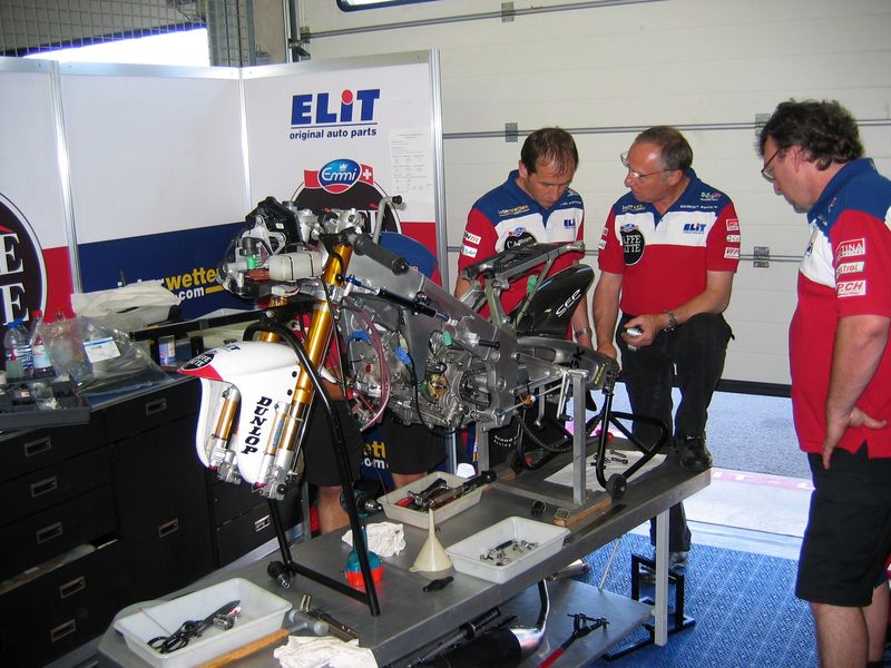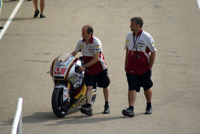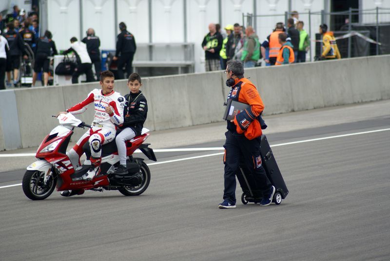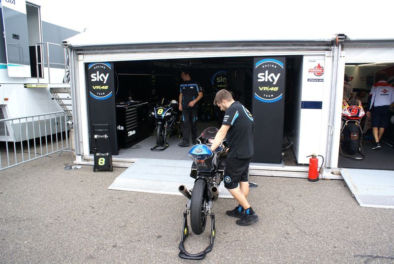 Und jetzt sind wir bei den Boxenteams. Da ist recht wenig Glamour ABER dafür verdammt viel Arbeit angesagt. Das sind für mich die Helden des Wochenendes. Wenn der Fahrer wieder einmal die Maschine im Kiesbett kaltverformt hat und das gute Stück als 3-D-Puzzle in die Box transportiert wird. Steht keine Zweitmaschine zur Verfügung (wie vorgeschrieben in der Moto 2) dann heißt es die Finger fliegen lassen, damit das Motorrad zum nächsten Training wieder fahrfertig und konkurrenzfähig ist.