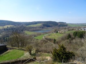 Weiter geht es jetzt mitten hinein nach Prüm und wir haben es nicht mehr weit bis zu unserer ersten Pausenstation. Also auf die Zähne beißen und nicht an der Eisdiele am „Hahnplatz“ haltmachen. Genau von dieser Stelle fahren wir etwa für 11 km nochmals ein kurzes Stück Bundesstraße. Wir sind auf der B 265 und rollen an Tafel und Knaufspesch vorbei bis es kurz darauf nach rechts auf die L 20 in Richtung Ormont geht. Von Ormont fahren wir nach Hallschlag. Wir sind jetzt nur noch ca. 3 km von der Grenze nach Belgien entfernt. Hallschlag gehörte geschichtlich zur Herrschaft Kronenburg und genau in dieses Herrschaftsgebiet wollen wir hin. Wir sehen auch schon den Kronenburger See zu unserer Rechten und kurz hinter dem See geht es für uns links ab nach Kronenburg.