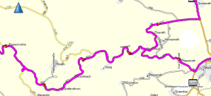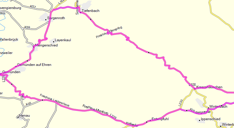 Etwas verzweigt folgt unser Weg dann der Route über Gebroth und Winterbach auf der K 26 wieder der Wegweisung nach Gemünden. Die ruhige Streckenführung dorthin erfolgt über die Landesstraßen L 230 und 229 an Entenpfuhl und zwei Forsthäusern vorbei.