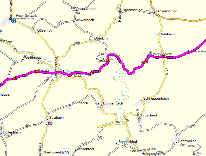 In Gemünden sind wir wieder auf unserer altbekannten Route vom Hinweg und rollen jetzt in der anderen Richtung nach Rhaunen und Stipshausen. Damit es nicht eintönig wird folgen wir jetzt der Wegweisung nach Hinzerath und landen dann kurz auf der B 327 nach Morbach. Kurz bedeutet in diesem Fall knappe 7 km, also auszuhalten.