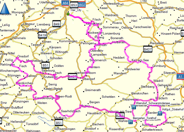 Danach folgt unser Weg der B 407, die uns aber trotz der Widmung als Bundesstraße einen schönen kurvigen Weg über Irsch nach Saarburg weist. Wir biegen am Ortseingang nicht ab auf die Umgehung, sondern bleiben auf dem Weg in Richtung des Stadtteils Beurig. Das hat zwei Gründe. Der erste Grund ist eine gute Metzgerei direkt an unserer Wegstrecke auf der linken Seite, die sich geradezu dafür anbietet noch Wegzehrung im Tankrucksack unterzubringen. Für die Alleinreisenden unter uns, denen es zuvor unterwegs an Unterhaltung mangelte, hat es nun den Vorteil, dass zumindest das Frikadellenbrötchen jetzt mit ihnen redet. Der zweite Grund ist, dass wir von unserer Anfahrt her einen wunderbaren Blick auf die namensgebende Saarburg haben und damit auch einen schönen Fotopunkt.