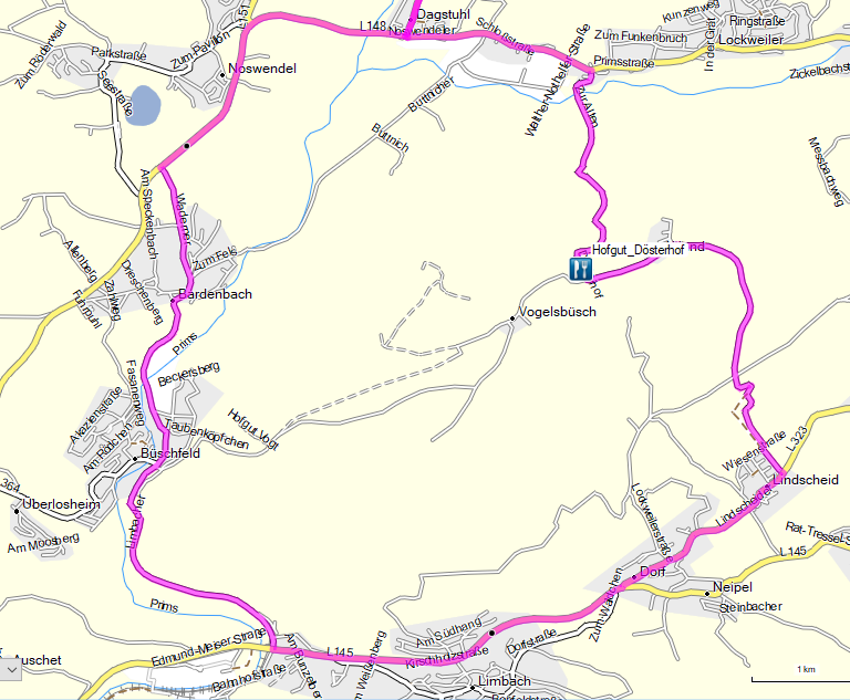 Nach dem Hofgut fahren wir unsere Schleife zu Ende und rollen über Lindscheid, Limbach und Büschfeld zurück nach Dagstuhl (Wadern).