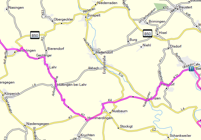 Über Halsdorf und Enzen geht es nun weiter und wir queren für erfahrene Anderstourer einige unserer früheren Routen. Die nächsten Ortsnamen sind Hommerdingen, Lahr und Geichlingen und dann landen wir zwischen Koxhausen und Gaymühle auf der K 50. Hier sind wir jetzt bis Rodershausen auf einer für uns bekannten Strecke. In Rodershausen biegen wir links ab auf die L 1, die wir aber nach knappen eineinhalb Kilometern wieder nach rechts (Waldhof Falkenstein) verlassen.