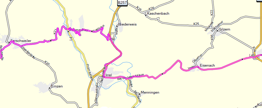 Wir suchen uns aber nicht für den weiteren Weg die B 50 aus, sondern biegen rechts ab auf die K 5, der wir schon so häufig parallel zum Flusslauf der Sauer folgen. Hinter Wallendorf sind wir dann auf der L 1 und landen in Bollendorf. Natürlich sind wir schon lange auf unserem Rückweg, aber den gestalten wir natürlich wieder mit einer kleinen Schleife auf Nebenstrecken. Beim Lager Weilerbach biegen wir links ab auf die K 19 nach Ferschweiler. Hier geht es in der Ortslage links ab auf die K 21 nach Prümzurlay, wo wir der Beschilderung zur Prümerburg folgen. So landen wir kurz auf der B 257 nach Irrel.