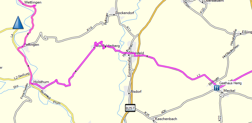 Waren wir gerade noch an der Kyll landen wir jetzt bei Holsthum an der Prüm auf der L 4. Die verlassen wir schon alsbald um in Richtung Peffingen auf die L 7 abzubiegen.