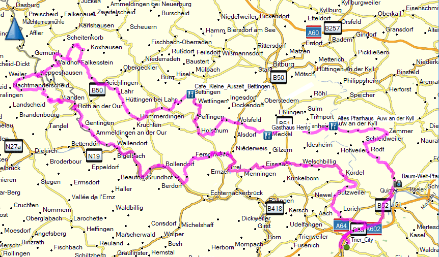 Jetzt sind wir wieder auf alten Bekannten unterwegs, die uns über Eisenach, Helenenberg und Welschbillig nach Kordel führen. Wir haben ja noch Zeit und so nehmen wir in Kordel nicht den direkten Weg nach Trier, sondern nehmen zum Abschluss noch ein paar Kurven auf der L 43 nach Butzweiler mit, um dann über die K 24 wieder abwärts nach Trier-Biewer zu gelangen.