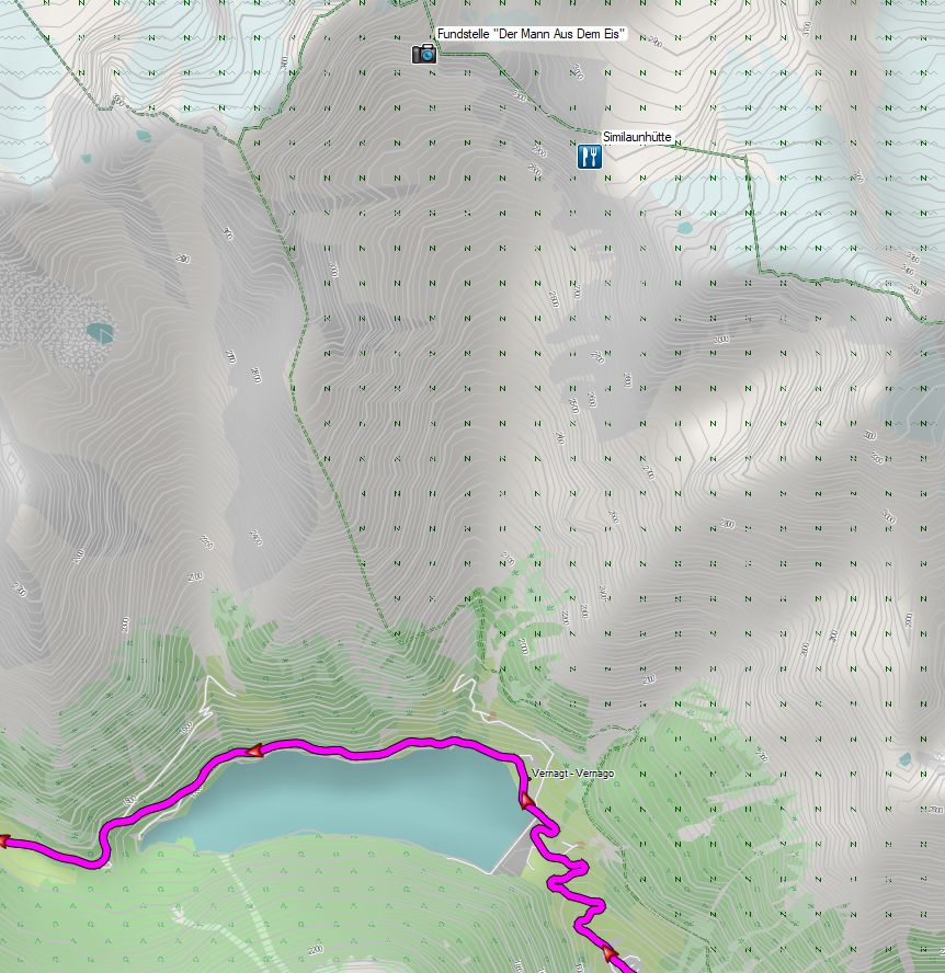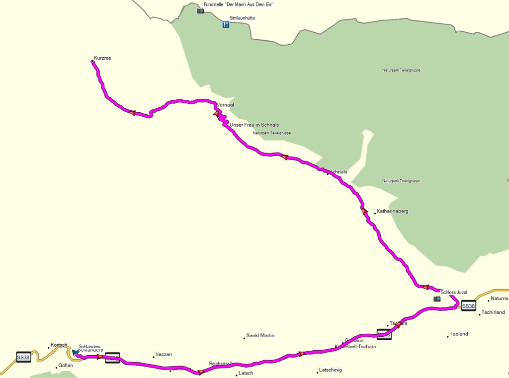 Es ist eine schöne Routenführung aufwärts zum Talschluß bei Kurzras. Allein schon die wunderbare Kurvenkombination hinter Unsere Frau in Schnals hoch zum Vernagt-Stausee hat Ansteckungsgefahr.