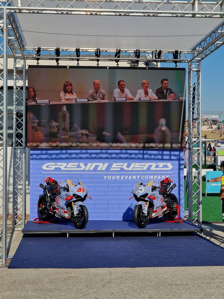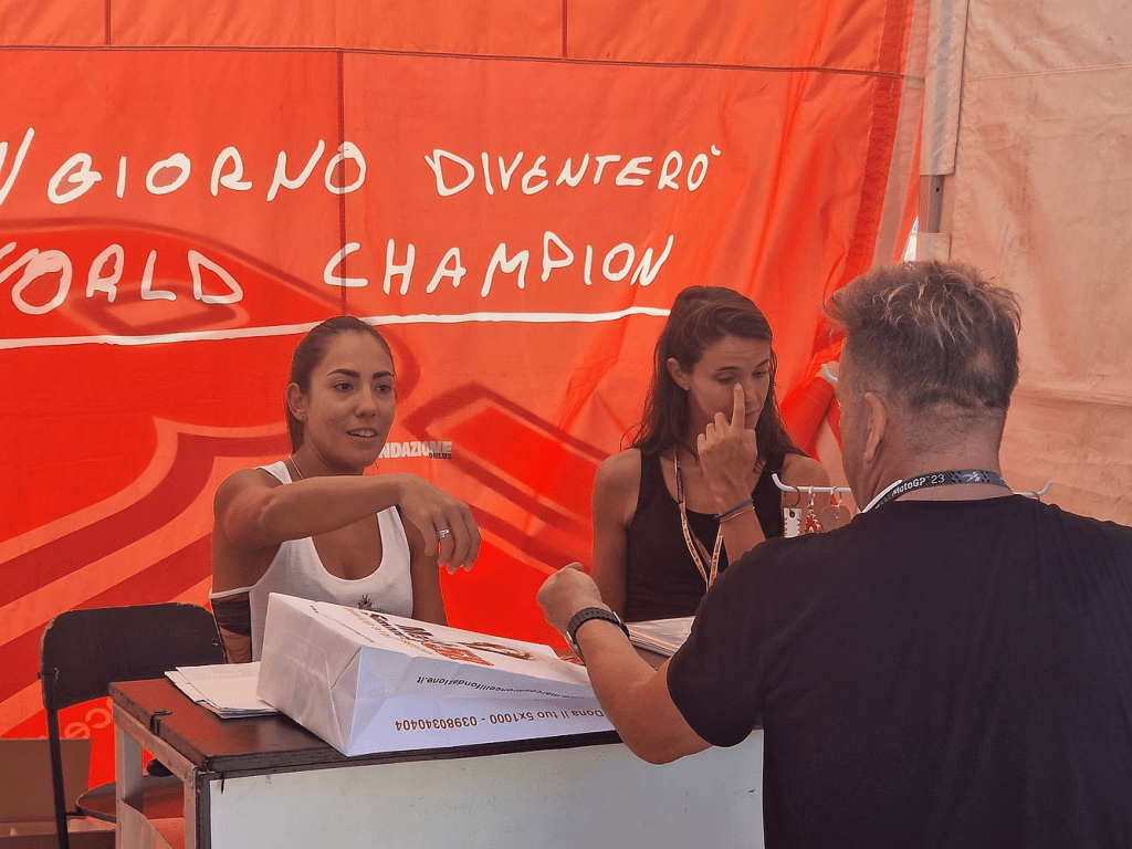 Und da sind wir bei den „Emozioni“, den Emotionen, die man wahrscheinlich in Sachen Motorradrennsport nur in Italien findet. Da ist dann zwischen den ganzen Firmen am Rennwochenende auch ein Stand der Marco Simoncelli Foundation zu finden und die Freundin von Marco, Kate Fretti, steht persönlich am Stand und erklärt den Fans die Hintergründe und Ziele der Foundation.