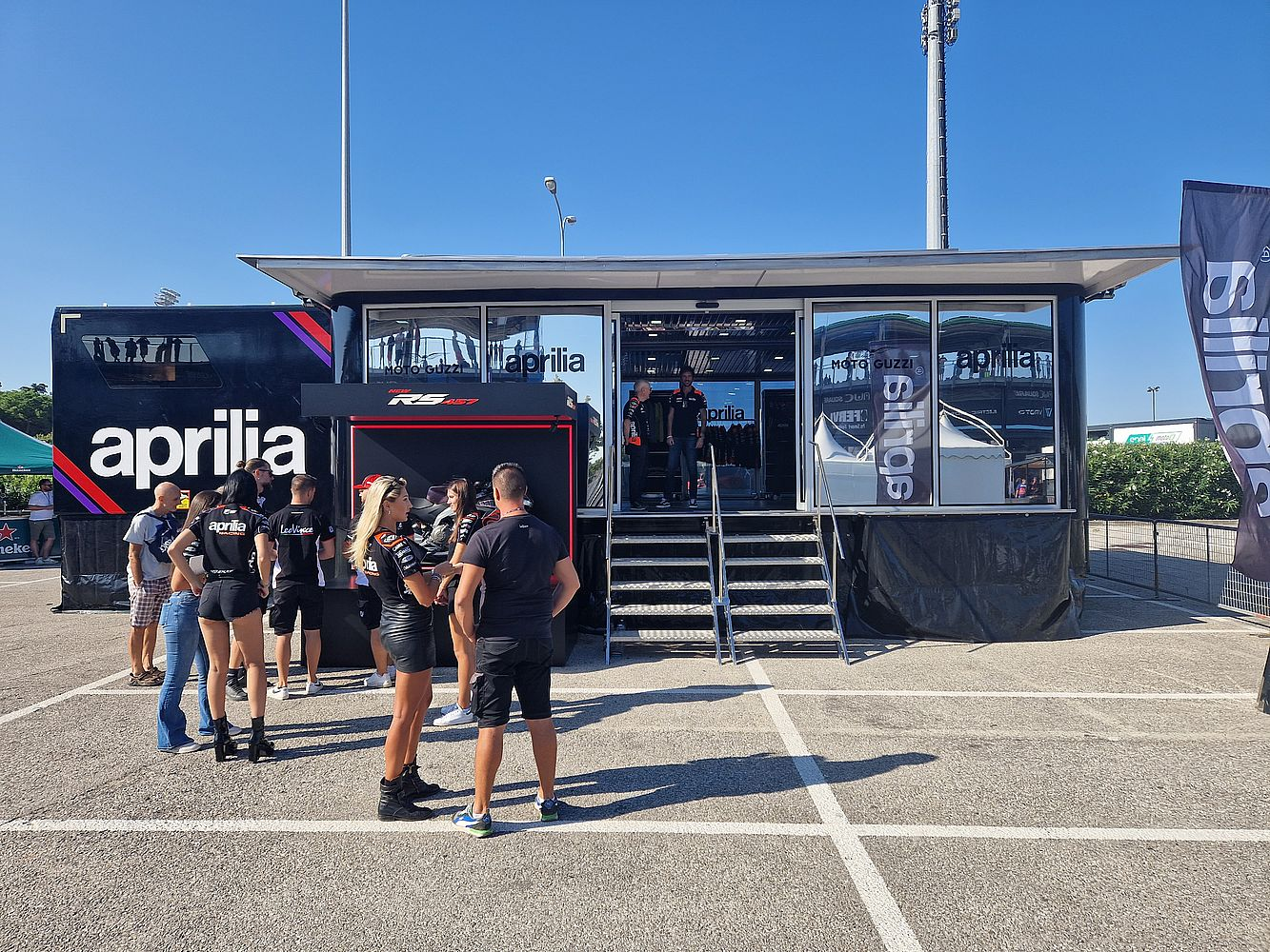 Rundherum gibt es in diesem Tribünenbereich einiges zu schauen. Im Gegensatz zum Sachsenring ist Misano eine permanente Rennstrecke. Insofern haben sich dort einige Firmen und Händler mit Bezug zum Rennsport angesiedelt.