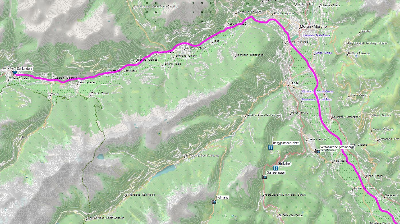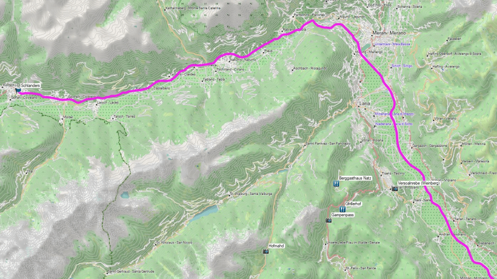 Raus geht es aus Schlanders in Richtung Meran / Bozen. Wir können hier unsere üblichen „Verdächtigen“ wählen und nutzen die Vinschgauer Staatsstraße bis Meran und in der Folge die „Mebo“ bis zur Ausfahrt Eppan. Das wäre die D-Zug Variante. Die andere Option ist runter von der „Mebo“ bei Lana und dann den Gampenpass bis Abfahrt Prissian. Auch die Route kennen wir bereits und rollen dann über kleine Landsträßchen bis Frangart