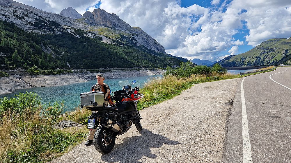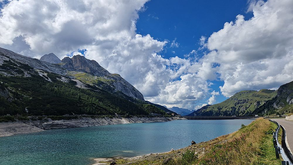 Für uns geht es weiter über Alleghe und dem traumhaft gelegenen Lago di Alleghe vorbei nach Caprile und dann mit bis zu 15 % Steigung aufwärts zum Passo di Fedaia. Die Ladiner sagen Jouf de Fedaa. Der Pass liegt mit seinem schön gelegenen Stausee von knapp 2 km Länge zu Füßen der Marmolada, der Königin der Dolomiten. Mit 3.343 m Höhe ist die Marmolada, oder auf Italienisch Marmolata, auch der höchste Berg der Dolomiten.