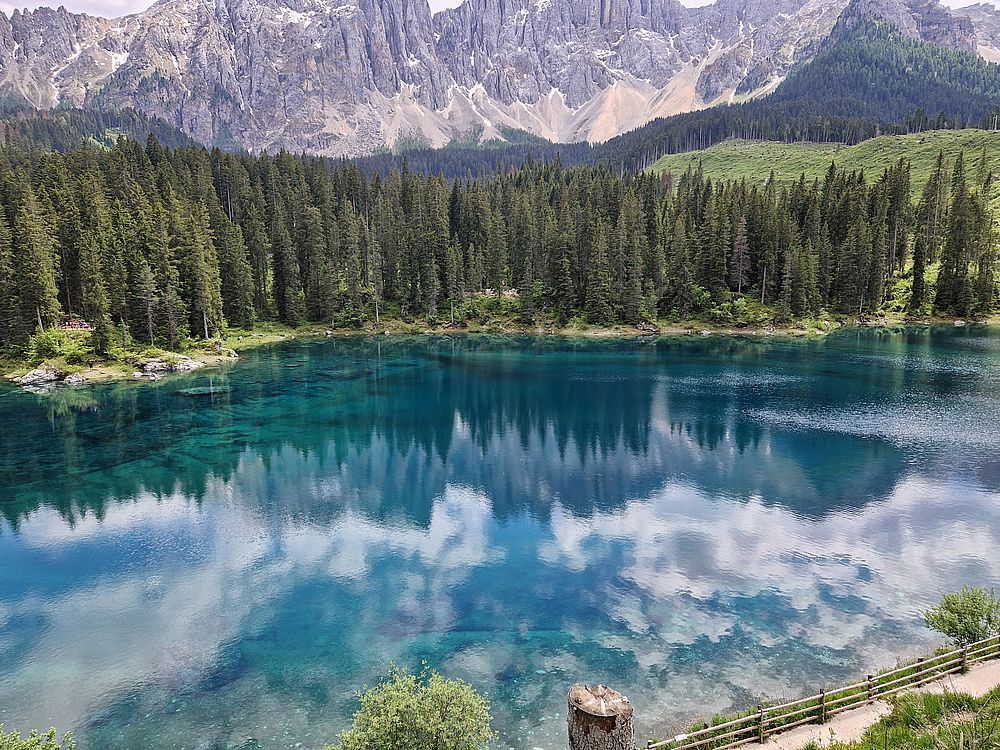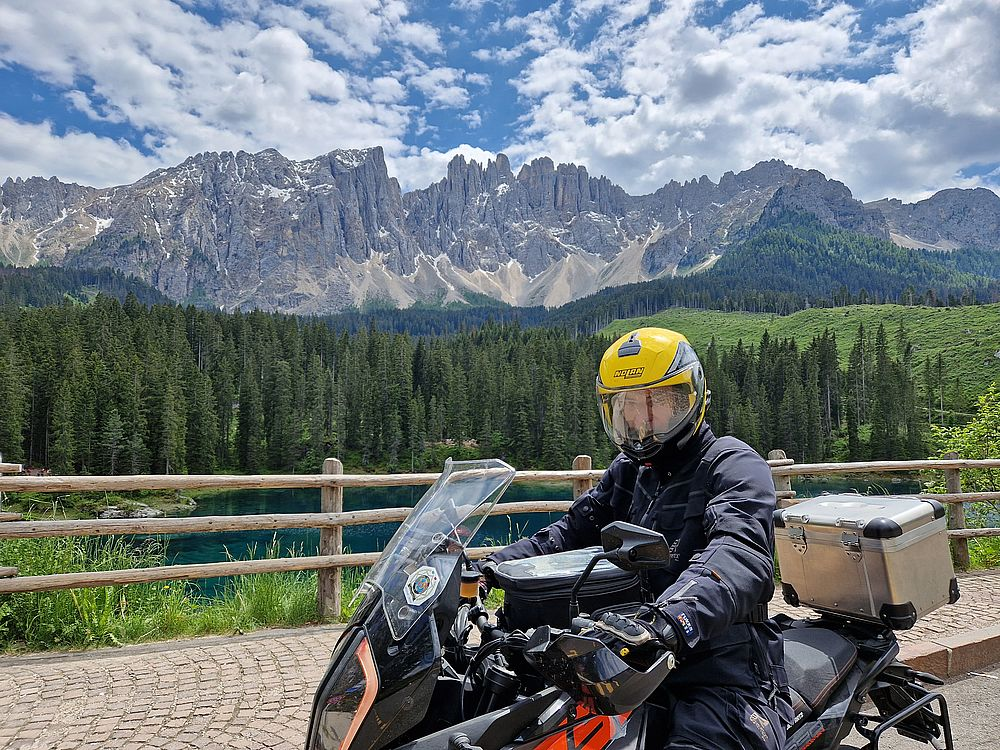 Wir rollen heute ausnahmsweise den direkten Weg, abwärts über Karersee, Welschnofen hinunter ins Eisacktal und an Bozen vorbei auf die Mebo.