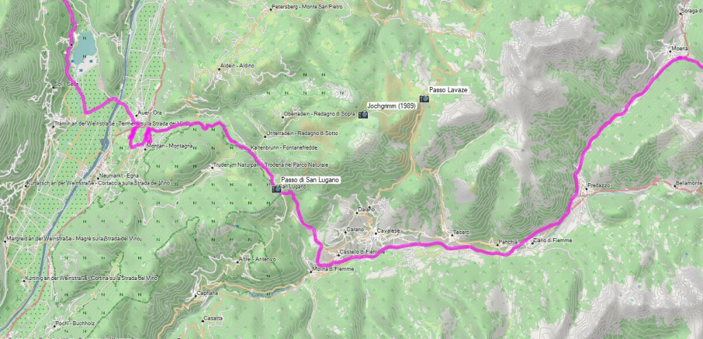 Kurvig geht es an Montan vorbei zum Passo San Lugano, den wir fast unbemerkt überschreiten und dann abwärts ins Val di Fiemme, der Hochburg des nordischen Skisports in Italien.