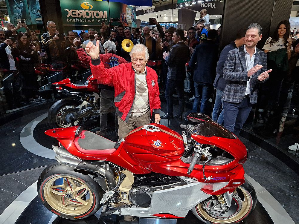 MV Agusta ist auch da. Und wie! Das Idol und der Nationalheld Italiens Giacomo Agostini war auch mit am Stand und wurde von den Tifosi bejubelt. Das gibt es nur in Italien. Die Fans vergessen hier niemanden.