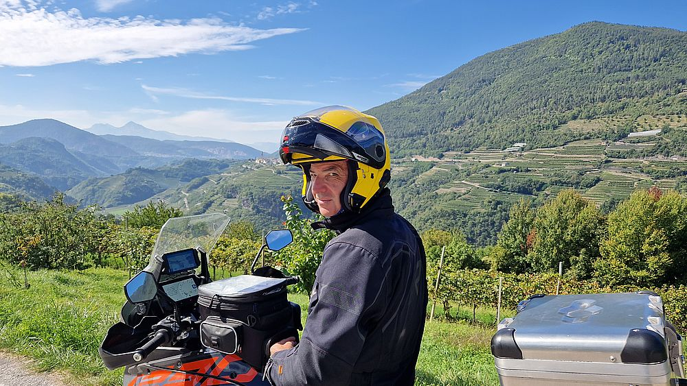 Den ersten Teil unserer heutigen Route kennen erfahrene „Anderstourer“ bereits. Wir können wählen. Zeitig aufgestanden und gestartet? Also dann – bei Lana runter von der Mebo und ein kurzes Stück den Gampenpass aufwärts bis wir links nach Prissian abbiegen und uns dann talabwärts auf kleinen Sträßchen nach Frangart begeben. Hier geht es dann wieder in das Zentrum des Weinanbaus, also Richtung Kaltern / Tramin.