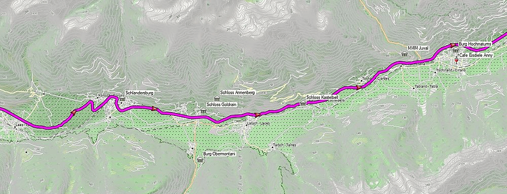 Kümmern wir uns also heute einmal auf den knapp 70 km Wegstrecke vom Reschensee bis Höhe Meran um das historische Thema der Burgen am Wegesrand. Gemessen an der Vielfalt an Burgen und Schlössern im Vinschgau entlockt einem die Zahl der Burgen im Mittelrheintal in Deutschland nur ein müdes Gähnen.