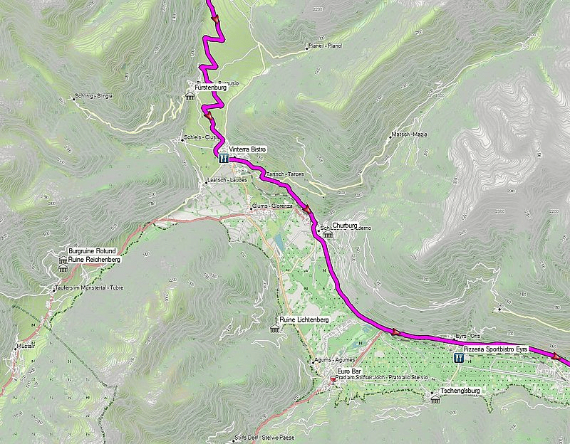 Also – wer bereits etwas länger unterwegs sein sollte und Hungergefühle oder einfach nur die Lust auf eine Pause aufkommt, der sollte unmittelbar zu Beginn der Ortslage Mals links auf den Parkplatz der Osteria Vinterra abbiegen und hier Verpflegung aufnehmen. Echt lecker. Immer wechselnde Tagesgerichte und die Tatsache, dass die Kundschaft größtenteils aus Einheimischen besteht ist aussagekräftig hinsichtlich der Qualität der Küche.