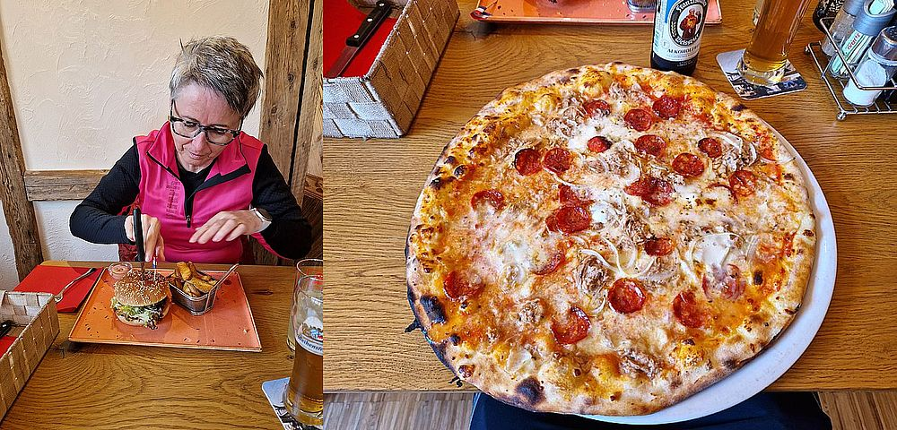 Sollten wir die „Mittagszeit“ bereits erreicht haben und die Tendenzen gehen eher in Richtung „herzhaft“, dann biegen wir in der Ortslage Eyrs an der Ampelanlage rechts in Richtung Tschengls ab. Hier legen wir Rast ein im Sport Bistro an der Sportanlage Eyrs. Der absolute Geheimtipp und von Einheimischen immer stark frequentiert, weil Preis- Leistungsverhältnis nahezu unschlagbar ist. So wie die vielseitige Küche. Man glaubt es kaum, dass die verschiedenen Geschmacksrichtungen Pizza, Burger und asiatische Küche zusammenpassen und auf gleich hohem Niveau präsentiert werden können. Hier klappt es – Empfehlung von uns: Unbedingt ausprobieren.