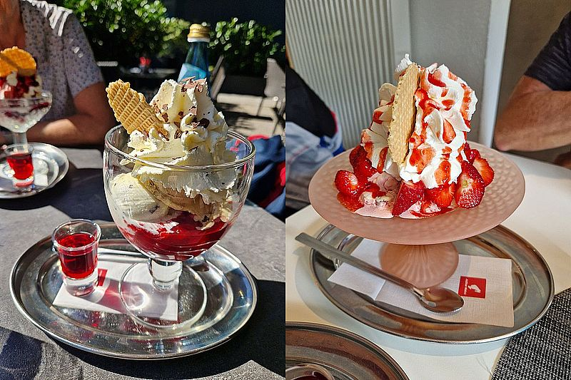 Wir waren ja bereits bei dem Themenfeld „Nahrung“ und was damit in Verbindung steht. Eis geht bei mir immer und die jetzt nächstgelegene Option sich mit einem leckeren Eisbecher zu belohnen ist, die Abzweigung in Richtung Prad am Stilfserjoch zu nehmen. Hier dann nichts wie rein in die Euro Bar und es sich gut gehen lassen. Übrigens – beim letzten „Alpenmasters“ 2023 konnte man hier auch die Testcrew der Fachzeitschriften beim Eisschlecken treffen.