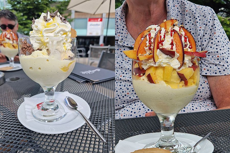 Dann hinein nach Naturns und im Cafe Anny in der Ortslage einen feinen Eisbecher geschlemmt. Egal welcher – alle sind fein. Mein Favorit: Der „Jumbo“. Ersetzt kalorientechnisch mehrere warme Mahlzeiten und ist echt lecker.