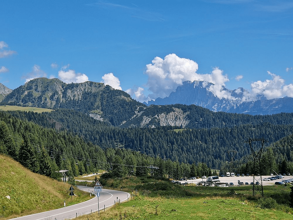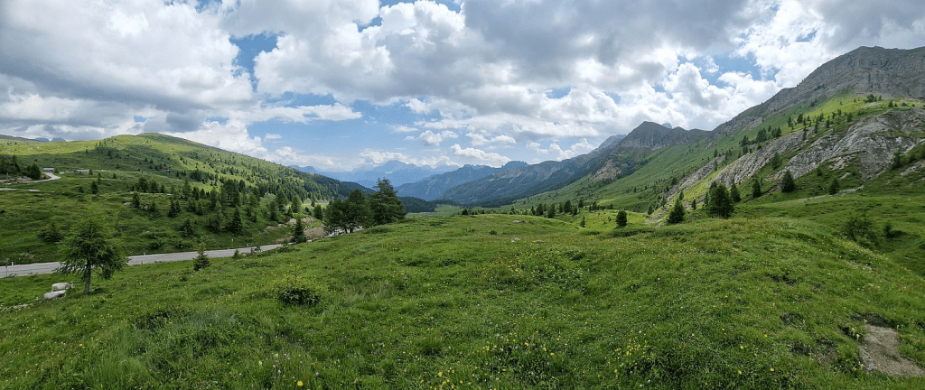 Falsch machen können wir auch jetzt nichts, also rollen wir talabwärts in Richtung Falcade. Und unser nächster Darsteller ist auch schon ausgeschildert. Es geht zum Passo San Pellegrino, im Süden der bekannten Marmolada gelegen. Im Winter ein stark frequentiertes Skigebiet, haben wir jetzt bei der Auffahrt den ein oder anderen Fahrradfahrer als Begleiter auf der Strecke.