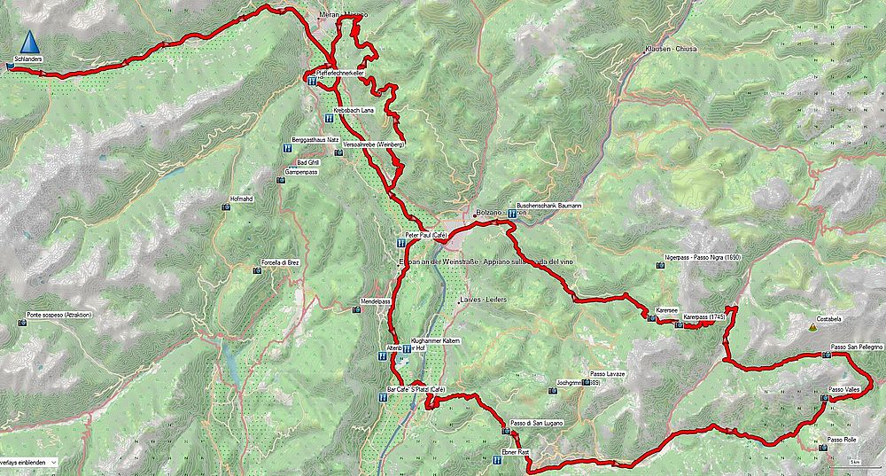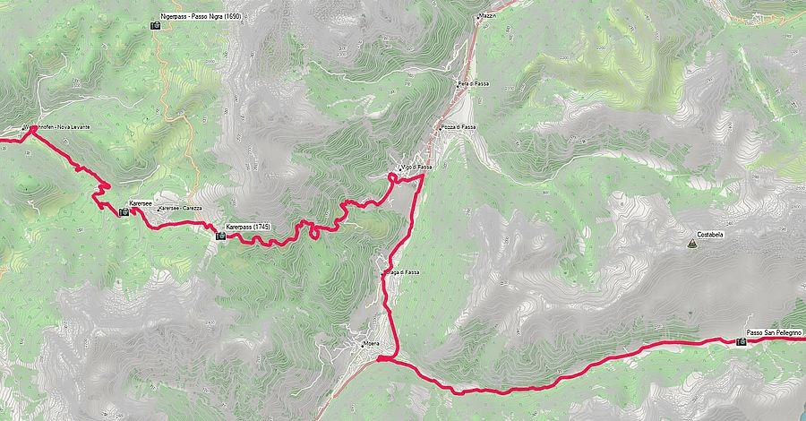 Wie bei der Giro-Bergetappe 2003 geht es jetzt für uns vom San Pellegrino abwärts nach Moena ins Fassatal. In Vigo di Fassa ist der nächste Protagonist unserer heutigen Tour bereits ausgezeichnet. Der Karerpass – traumhaft an den Hängen des Latemar gelegen und Grenze zwischen Südtirol und Trentino. Unten im Fassatal hört er noch auf seinen Namen Passo Costalunga. Wir fahren ihn, von hier unten aus dem Fassatal kommend, lieber bergauf, als aus der Richtung Bozen kommend. Irgendwie ist der Streckenverlauf und die Ausblicke für uns harmonischer. Aber – wie so oft im Leben ist alles Geschmacksache.