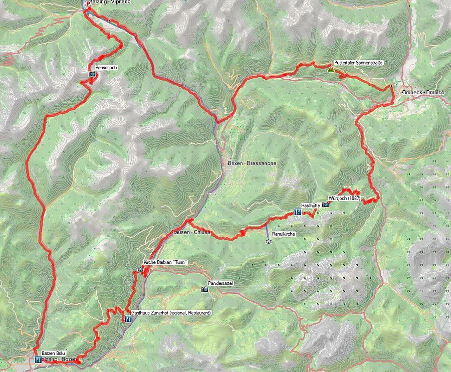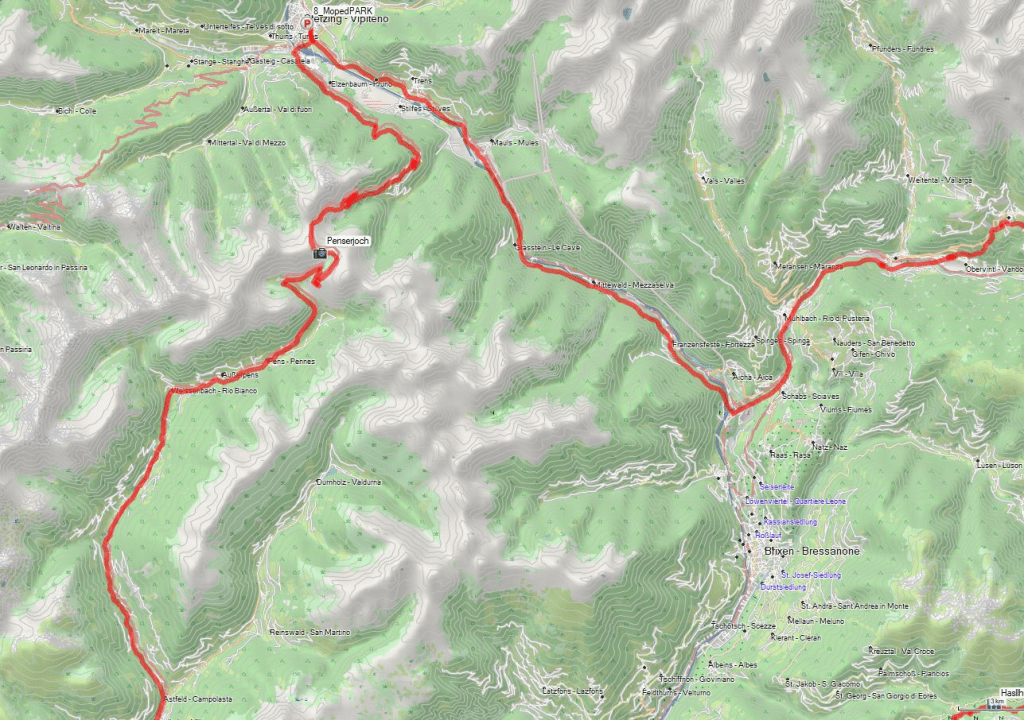 Kennt IHR das eigentlich auch, dass ihr bei gewissen Strecken oder Zielen eine gewisse Fahrtrichtung favorisiert? Bei mir ist das z. B. beim Penserjoch so. Eigentlich fahre ich es lieber aus Richtung Sterzing kommend und dann, wie bei einem Abfahrtslauf den Zielhang hinabrutschend, durch das Sarntal nach Bozen. Heute also einmal umgekehrt und die Perspektiven aus dieser Richtung genießend.
