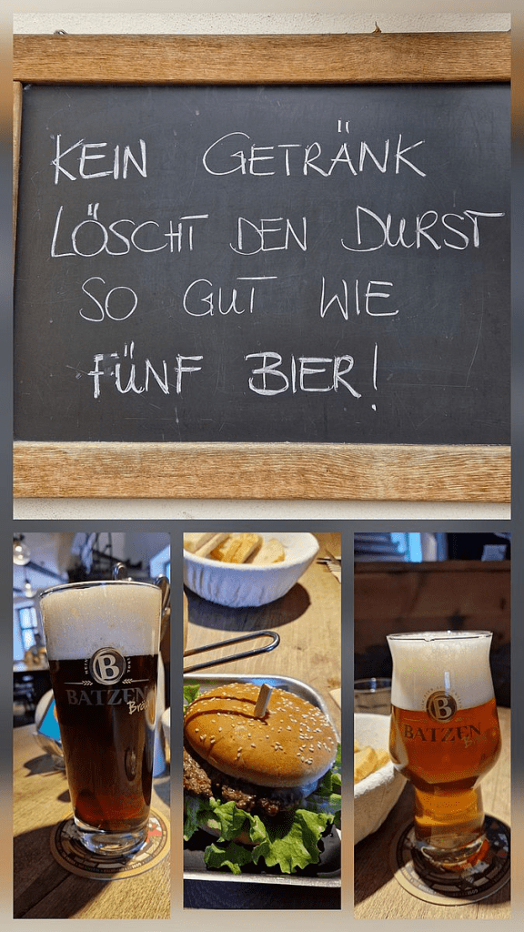 Gleich haben wir unsere Einführungsrunde in die Saison 2026 erledigt. Hinein nach Bozen und dann lassen wir unseren Tag im „Batzenbräu“ ausklingen. Wer sich bislang noch nicht verpflegt hat, der kann es hier bei guter regionaler Küche, bis hin zu Spareribs, Batzenburger oder Künstlerpfanne tun. Dem Motto des „Batzenbräu“ hinsichtlich der Bekämpfung von Durst kann ich nichts mehr hinzufügen. Es treibt mir immer ein Schmunzeln ins Gesicht.