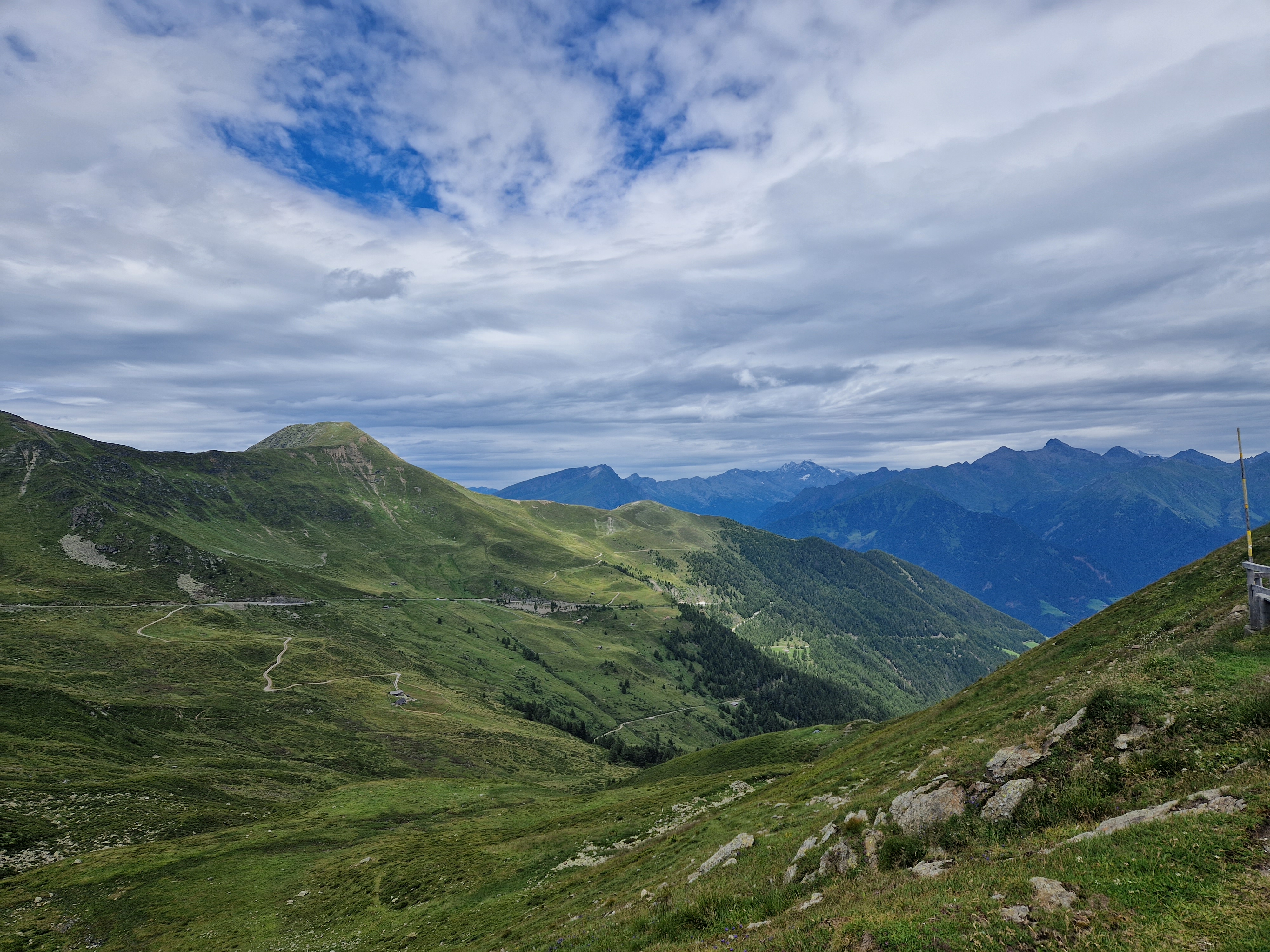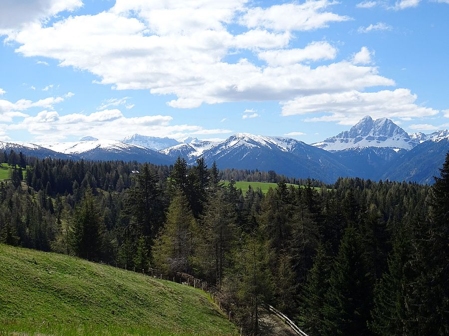 Also nichts wie weg und ab Vintl hinauf auf die Pustertaler Sonnenstraße. Kaum länger als die Strecke im überlaufenen Tal der Rienz verläuft die Sonnenstraße auf der Höhe über Terenten und Pfalzen bis nach Bruneck, bietet uns die gewünschte Ruhe, die namensgebende Sonne und schöne Ausblicke.