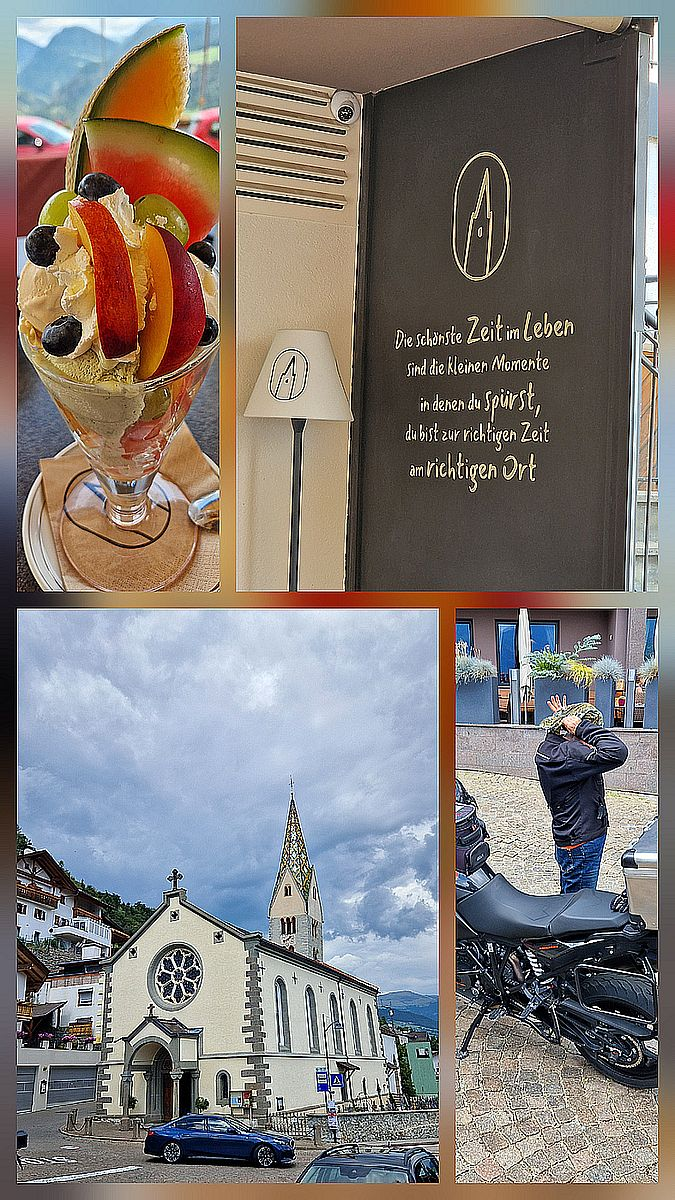 Dann geht es abwärts in Richtung Sterzing, dem Einfallstor nach Südtirol, wenn man aus Richtung Brenner kommt. Wie ihr aus vorangegangenen „Anderstouren“ wisst kann man in Sterzing durchaus auch eine kleine Rast einlegen und dies mit einer Nahrungsmittelaufnahme verbinden. Die kleine gemütliche Fußgängerzone lädt dazu mit seinen Restaurants und Cafes ein.