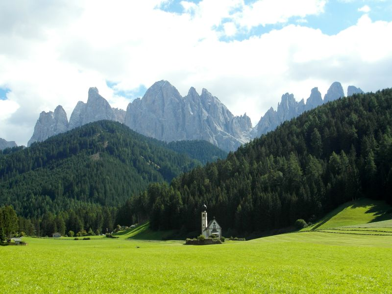 Wir sind jetzt hier im Naturpark Puez Geisler. Die namensgebenden „Geislerspitzen“ sehen wir aber bald bei unsere Abfahrt ins Tal zu unserer Linken. Wenn wir die ersten Bauernhöfe an unserer Strecke sichten, können wir einen Fotohalt einlegen. Der wunderbare Blick auf die Geislerspitzen und das Ranuikirchlein sollte verewigt werden.
