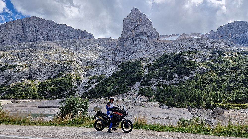 Für uns geht es weiter über Alleghe und dem traumhaft gelegenen Lago di Alleghe vorbei nach Caprile und dann mit bis zu 15 % Steigung aufwärts zum Passo di Fedaia. Die Ladiner sagen Jouf de Fedaa. Der Pass liegt mit seinem schön gelegenen Stausee von knapp 2 km Länge zu Füßen der Marmolada, der Königin der Dolomiten. Mit 3.343 m Höhe ist die Marmolada, oder auf Italienisch Marmolata, auch der höchste Berg der Dolomiten.