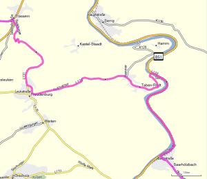Ein kurzes Stück flussaufwärts überqueren wir die Mosel und sind jetzt auf der D 64. Über Contz-les-Baines und Berg-sur-Moselle suchen wir uns den Weg zum nächsten Zwischenziel. Gavisse/Beschtingen und Faulbach lassen wir an unserer Strecke unbemerkt liegen und notieren sie gedanklich nur unter dem Aspekt – Wir sind auf dem richtigen Weg.