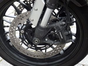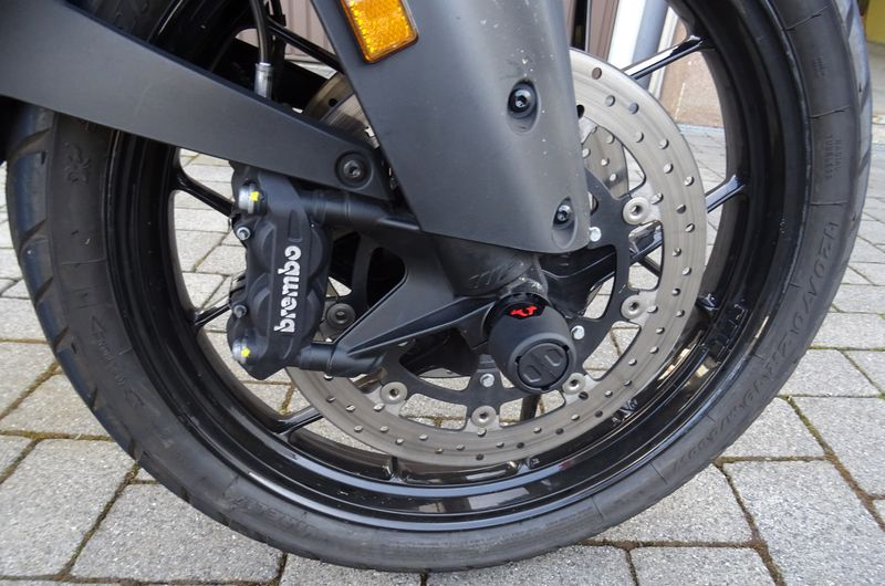 Der Road Attack baut Vertrauen so ganz selbstverständlich nebenher auf, dass es eine Pracht ist. Continental hat unter dem Begriff Traction Skin eine neuartige Reifenoberfläche konstruiert. Verzicht auf die üblichen Trennmittel und eine speziell beschichtete Reifenform, gepaart mit einer raueren Oberfläche und vom ersten Meter an war, trotz der noch winterlichen Temperaturen, zwischen Null und drei Grad ein sattes Gefühl für den Reifen in Sachen Rückmeldung und Grip da. Insbesondere der Vorderreifen gibt einem zu jedem Zeitpunkt eine saubere Führung wie verzahnt mit der Fahrbahnoberfläche. Das berühmte Zitat wie auf Schienen bringt es wieder einmal auf den Punkt.