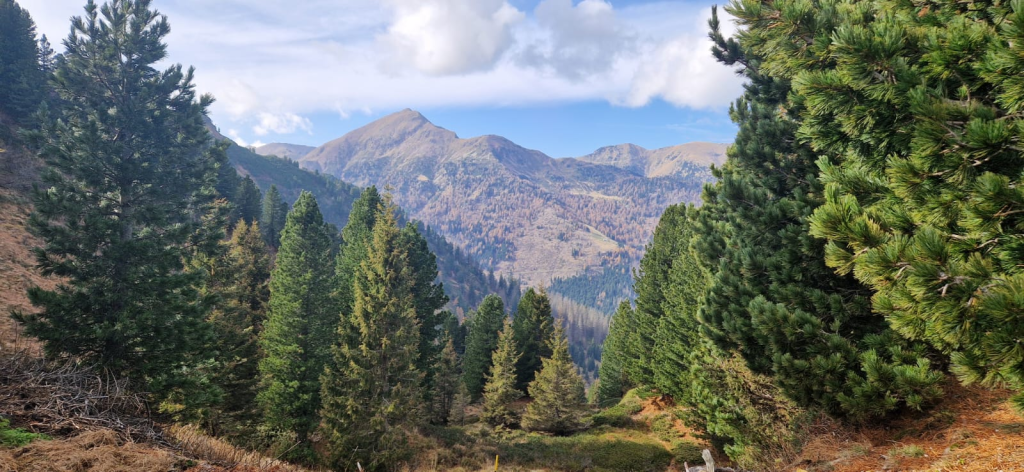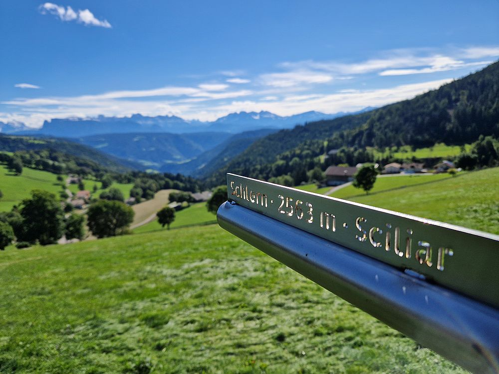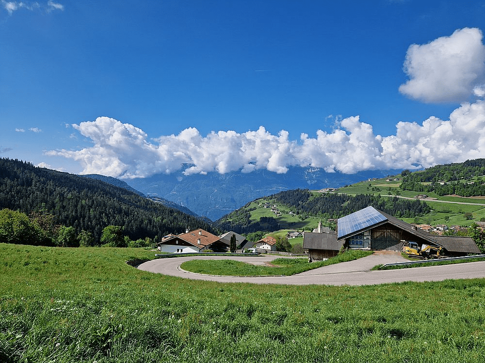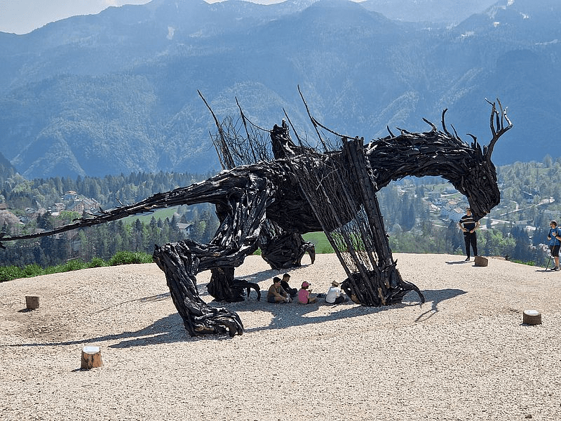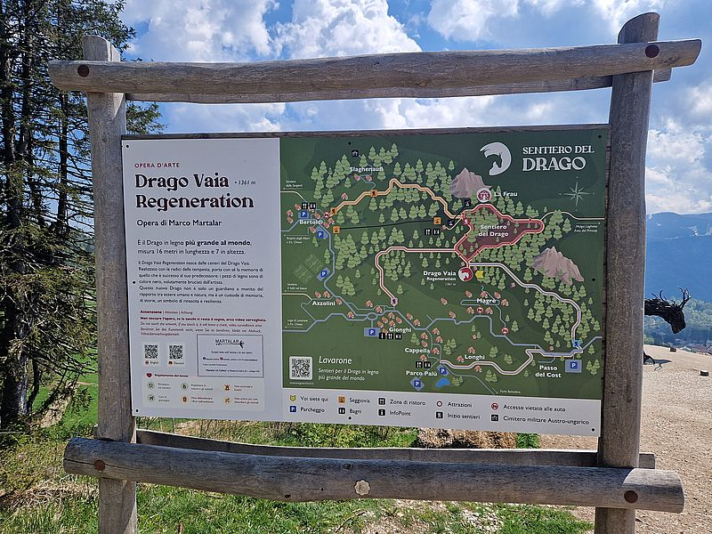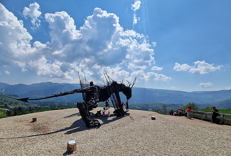 Wir wollen den geflügelten Drachen von Vaia besuchen. Vaia, weil einst das Sturmtief dieses Namens einiges an Baumbestand in der Region vernichtet hat. Marco Martalar, ein weltbekannter Künstler, nahm dies zum Anlass und schuf hier oben auf dem Hochplateau Tablat oberhalb von Magré ein wunderbares Kunstwerk.