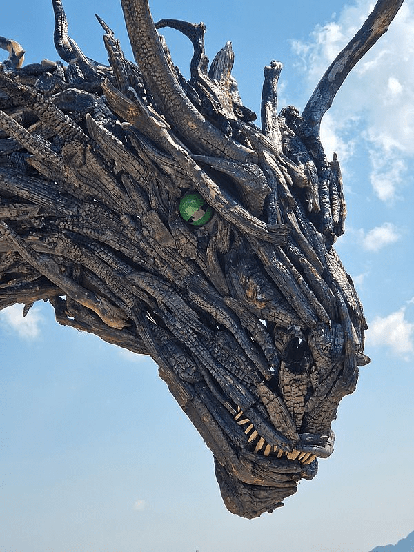 Entstanden ist die weltweit größte Drachenskulptur aus Holz. 6 m hoch und 7 m lang mit ihren 2.000 Holzstücken und etwa 3.000 Schrauben steht der Drache imposant vor uns und schaut uns mit seinen grünen Augen an.
