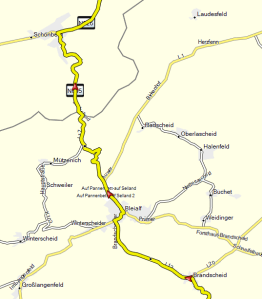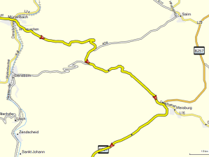 Wir fahren also weiter auf der L 46 und kurz nachdem wir zur Linken den Ort Zemmer passiert haben biegen wir nach rechts in Richtung „Wittlich“ (Dreis, Heidweiler) auf die L 43 ab. In leichten Schwüngen geht es etwas talabwärts nach Heidweiler und hinter dem Ort orientieren wir uns in Richtung „Binsfeld“ (Niersbach, Arenrath) auf die L 49. Hinter Arenrath kürzen wir etwas ab, um uns die Orstdurchfahrt Binsfeld zu ersparen und biegen rechts auf die K 43 ab nach Niederkail. Hier folgen wir dem Straßenverlauf der B 50 nach Landscheid. Ohne etwas an unserer „Fahrtrichtung“ zu ändern sind wir jetzt auf der L 34 und über Burg Salm, Hupperath, rollen wir in Richtung der Kreisstadt Wittlich (K 54).