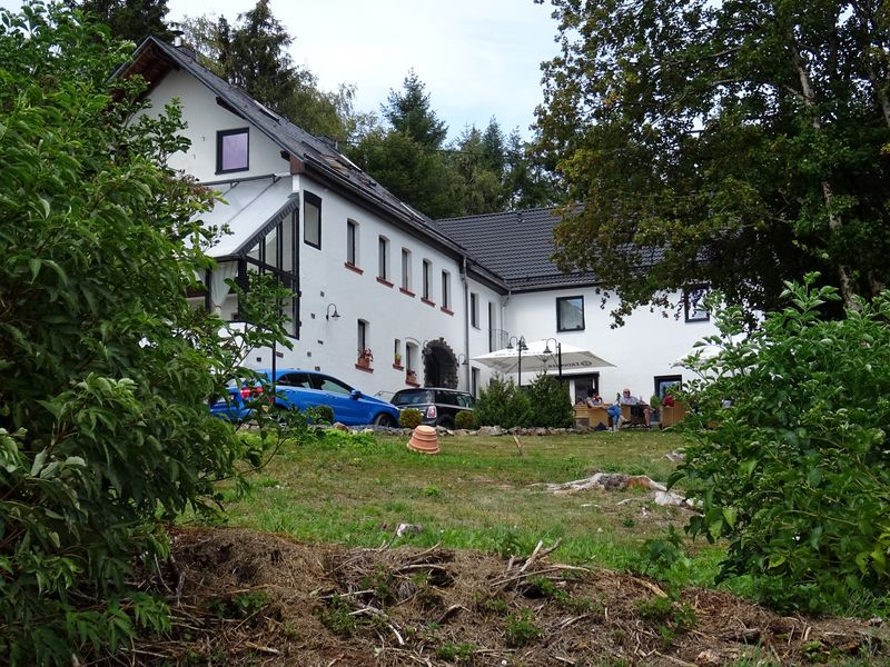 Aber genug davon, es wird Zeit die heutige Tour an einem gemütlichen Ort Revue passieren zu lassen und das nicht mehr allzu weit vom Zielort. Wir fahren also von Weiperath nach Hunolstein und kehren dort im Bauerncafe Hunolsteiner Hof ein. Unmittelbar hinter dem Ortsende führt ein geteerter Feldweg rechts ab zu dieser Lokalität. Ich muss nicht extra betonen, dass es hier in jedweder Form wieder etwas Gutes auf die Gabel gibt. Sei es gut bürgerliche Hausmannskost von der auch ein „ausgewachsener Motorradfahrer“ oder –fahrerin satt wird oder der hausgemachte Kuchen, der einen an den ein oder anderen Besuch auf der Dorfkirmes erinnert. Deshalb sind die „Kuchenstücke“ auch in einem Format, dass es bei einem Cafe in der Innenstadt zu „Kalkulationsproblemen“ käme.